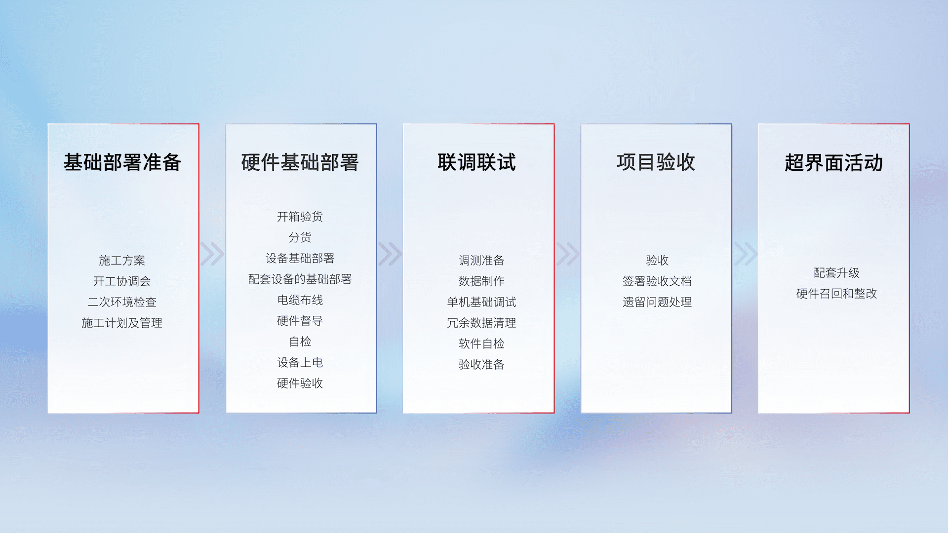 从基础部署准备、、、硬件基础部署、、联调联试、、、、项目验收、、、越界面活动的全过程可追溯,,保证施工质量和进度。。。。